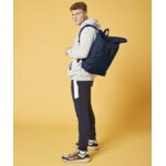 Made from 100% recycled polyester, this eco-conscious design is produced from the equivalent to approximately 12 post-consumer plastic bottles. This functional roll-top style features an easy access padded laptop compartment, external bottle pocket and zippered internal pocket. The front pocket has been designed for decoration and encloses an internal organiser. Padding in the back panel and adjustable shoulder straps give load carrying comfort and the roll-top closure provides fashionable functionality. Webbing carry handles add to the distinctive look and mean this style can be worn on the back or can be carried by hand.